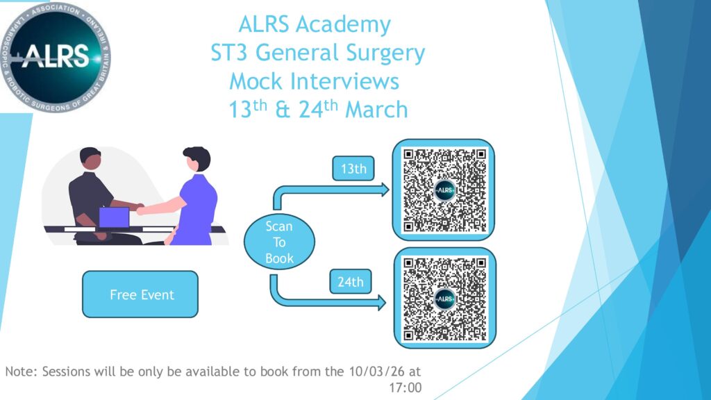 To book, please use one of the QR codes below. Please only book 1 session, there is a choice of 2 different dates. Category: CoursesBy ALSGBI AdminMay 7, 2025Leave a comment Author: ALSGBI Admin Post navigationPreviousPrevious post:LAPCO Train the Trainer (TT) course live online – 3rd & 17th March 2026 at 18:30 GMTNextNext post:Robotic Hepatobiliary & Pancreatic Surgery course, Harrow – 26th & 27th March 2026Related posts16th Laparoscopic Bile Duct Ultrasound Accreditation Course – 16th & 17th December 2026May 30, 202519th Laparoscopic Bile Duct Exploration Course – 18th & 19th November 2026May 28, 2025Advanced Upper GI Robotic Surgery course, Harrow – 7th & 8th November 2026May 27, 2025Advanced Robotic Colorectal Surgery course, Harrow – 7th & 8th October 2026May 24, 2025National Head & Neck course, Newcastle – 21st to 23rd September 2026May 23, 2025Robotic Surgical Skills course, Newcastle – 14th September 2026May 22, 2025