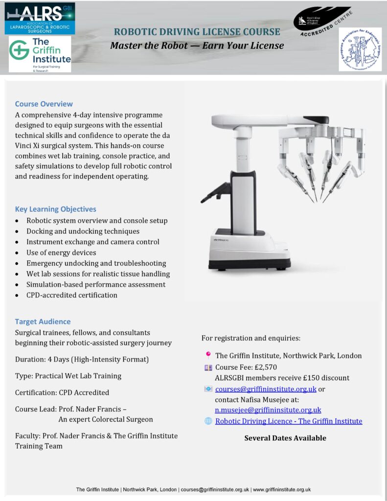 To find out more, and book, please click on the image below Please click HERE for the course timetable and HERE for the Robotic Skills manual Category: CoursesBy ALSGBI AdminMay 14, 2025Leave a comment Author: ALSGBI Admin Post navigationPreviousPrevious post:National Head & Neck course, Newcastle – 27th to 29th May 2026NextNext post:Introduction to Robotic Surgery course, Colchester – 10th June 2026Related postsAdvanced Robotic Colorectal Surgery course, Harrow – 7th & 8th October 2026May 24, 2025Robotic Right Hemicolectomy & Intracorporeal Anastomosis course, Harrow – 26th & 27th August 2026May 21, 2025Robotic Driving Licence course, Harrow – 14th to 17th July 2026May 17, 2025Transanal Endoscopic Surgery Course, York – 9th & 10th July 2026May 17, 2025Introduction to Robotic Surgery course, Colchester – 10th June 2026May 14, 2025National Head & Neck course, Newcastle – 27th to 29th May 2026May 13, 2025